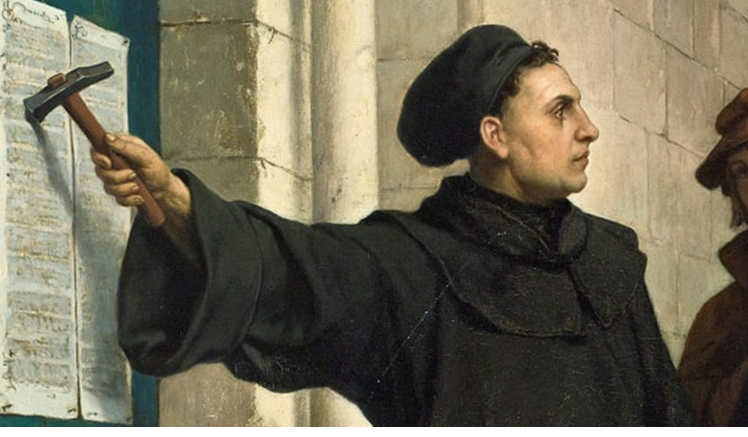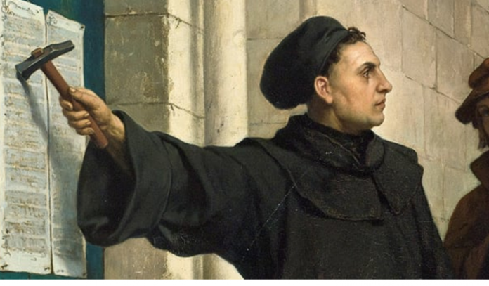 Martin Luther postoi 95 tezat e tij në derën e kishës në Wittenberg. Nëpërmjet tyre, Martin Luteri protestonte kundër shpërdorimeve të Kishës, veçanërisht ndaj shitjes së indulgjencave (letra për faljen e mëkateve). Këto teza u bënë nxitëse për reformimin e Kishës në Gjermani.
