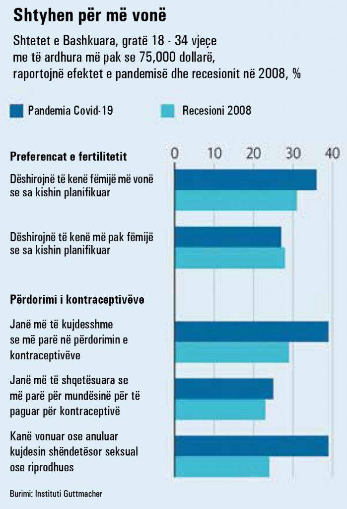 Ndërsa në vendet e zhvilluara, gratë zakonisht kanë kontroll më të madh në planifikimin familjar. Kjo do të thotë se ankthi nga pandemia mund të shkaktojë një rënie të ndjeshme në nivelin e lindjeve. Një sondazh nga Instituti Guttmacher i grave amerikane të moshës 18 deri në 34 vjeç, në familje që fitojnë më pak se 75,000 dollarë në vit, zbuloi se një e treta e tyre dëshiron të mbetet shtatzënë më vonë ose të ketë më pak fëmijë për shkak të Covid-19 (shih grafikun 1). Një studim nga Instituti i Ekonomisë së Punës IZA, parashikon një rënie prej 15% të lindjeve mujore në Amerikë midis nëntorit dhe shkurtit, 50% më e madhe se rënia pas krizës financiare në vitet 2007-‘09.