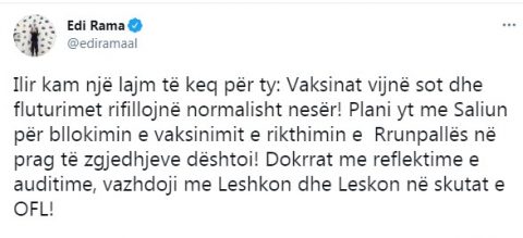 “Ilir kam një lajm të keq për ty: Vaksinat vijnë sot dhe fluturimet rifillojnë normalisht nesër! Plani yt me Saliun për bllokimin e vaksinimit e rikthimin e Rrunpallës në prag të zgjedhjeve dështoi”, shkruan Rama.