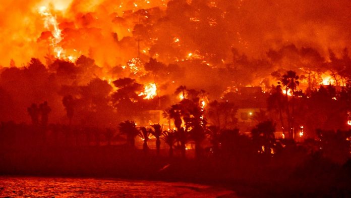 Aty shihet plazhi i Agia Anës i “mbytur” në të kuqe dhe i rrethuar nga zjarri, duke kapur në mënyrën më tronditëse situatën në zonë.