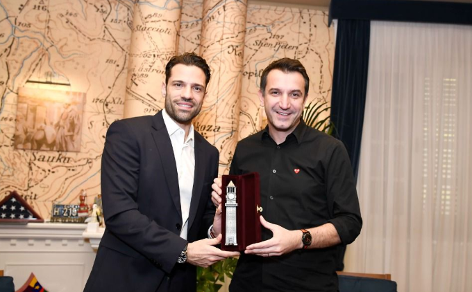 Argiros ka mbërritur ditën e sotme në Tiranë, ku është pritur edhe nga kryetari i Bashkisë, Erion Veliaj, i cili i dhuroi Kullën e Sahatit.