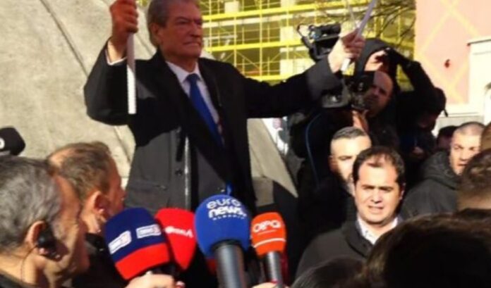 Berisha ka ndaluar pikërisht para ministrisë, ku i ka dhënë një mesazh ministrit Bledi Çuçi. Ndërkohë, para se të niste fjalimin, duket se ai është kapur edhe me një protestues, të cilin e ka cilësuar si provokues.