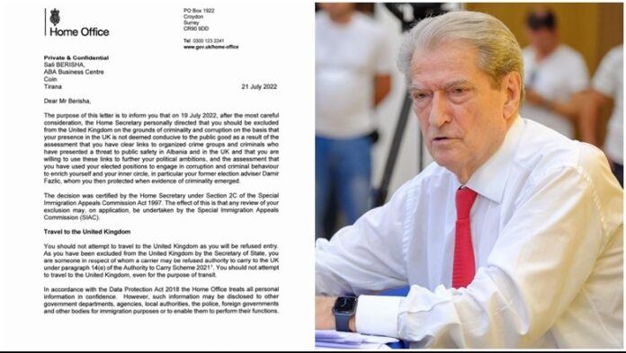 Kjo është përmbajtja e letrës që Home office i dërgoi Sali Berishës, pikërisht një vit më parë, më 21 korrik 2021 kur Mbretëria e bashkuar mori vendimin për ta shpallur non grata për shkak të lidhjeve të qarta me grupet e krimit të organizuar dhe kriminelët që kanë paraqitur një kërcënim për sigurinë publike në Shqipëri dhe në Mbretërinë e Bashkuar.