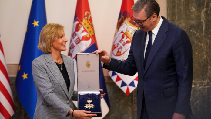 Presidenti Aleksandër Vuçiç i dorëzoi asaj Urdhrin e Flamurit Serb, Klasi i Parë, siç thuhet në njohtim, “për merita të veçanta në zhvillimin dhe forcimin e bashkëpunimit dhe marrëdhënieve ndërkombëtare midis Serbisë dhe SHBA-së”.