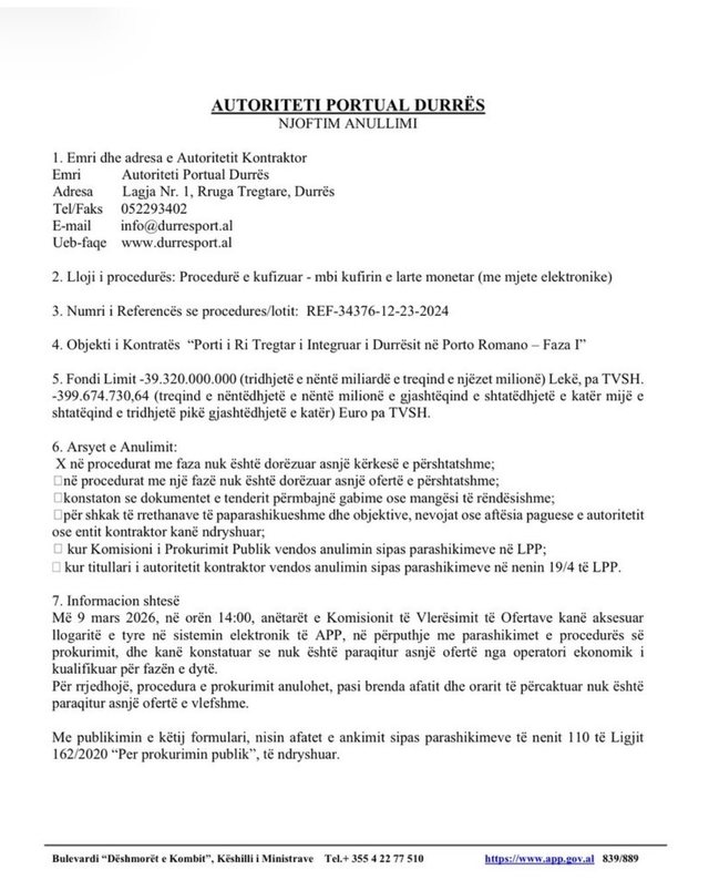 Tenderi për Portin e Ri tregtar në Porto Romano zyrtarisht i anulluar.