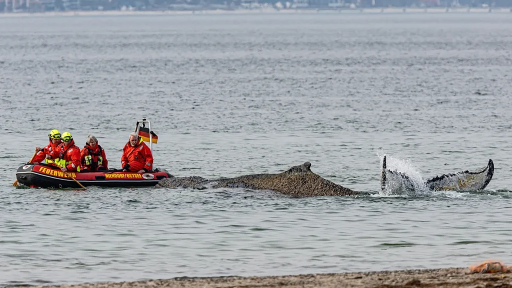 Në bregun e Timmendorfer Strand vazhdon misioni i shpëtimit të një balene gëzofshkurtër që ka mbetur e bllokuar në ujërat e cekëta të Detit Baltik për tre ditë.