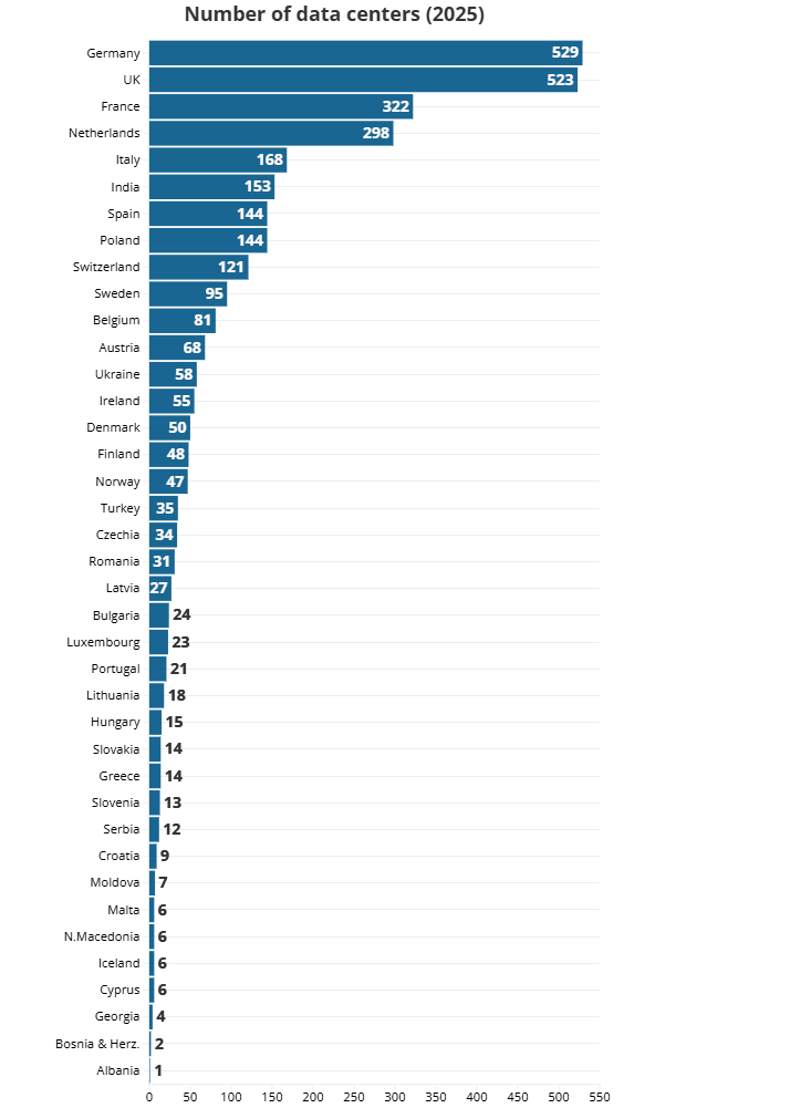 Pas pozicioneve të forta të Gjermanisë, Mbretërisë së Bashkuar, Francës dhe Holandës, vetëm disa vende të tjera europiane kanë më shumë se 100 qendra të të dhënave. Këto janë Italia (168), Spanja (144), Polonia (144) dhe Zvicra (121).