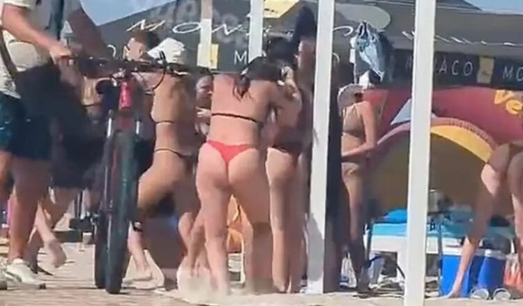 Një përleshje masive është regjistruar në plazhin e Odesës së shkatërruar nga lufta në Ukrainë, kur dy vajza të veshura me bikini u përplasën dhe u rrëzuan përtokë.