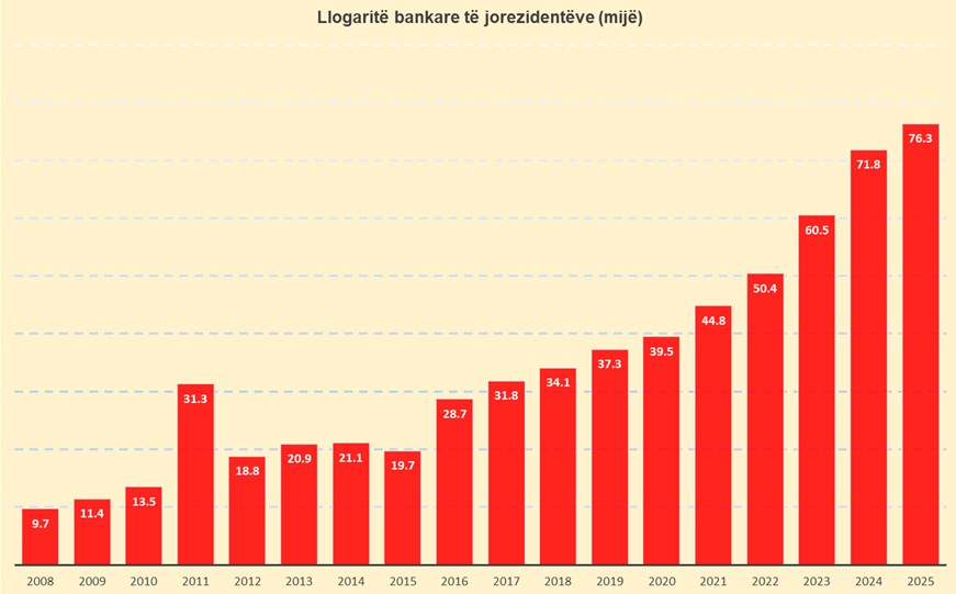 Sipas të dhënave nga Banka e Shqipërisë, numri i llogarive të jorezidentëve gjatë vitit 2025 u rrit me 6%. Numri i llogarive të jorezidentëve është në nivelet më të larta historike dhe dominohet nga llogaritë e individëve, me afërsisht 97% të totalit.