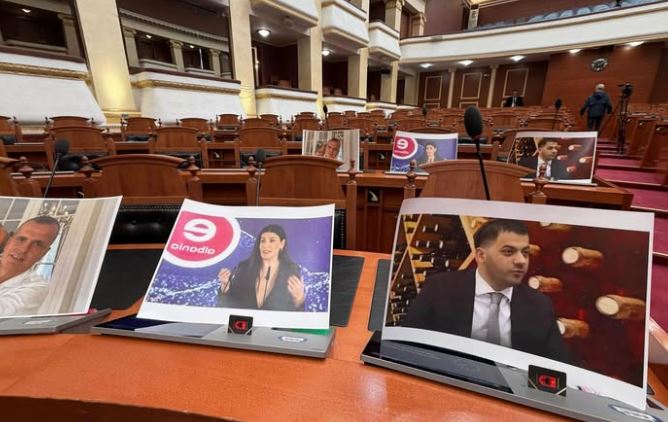 Opozita e ka nisur ndryshe senacën e sotme plenare. Në tavolina janë vendosur fotot e Mirlinda Karçanajt, Ergys Agasit dhe Ermal Beqirit. Tre personazhet më të përfolur së fundmi për aferat e AKSHI dhe jo vetëm.