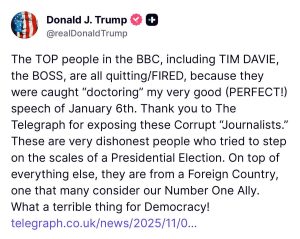Me anë të një postimi në Truth Social, Trump falënderoi “The Telegraph” për zbulimin e këtyre gazetarëve, që ai i quajti të korruptuar.