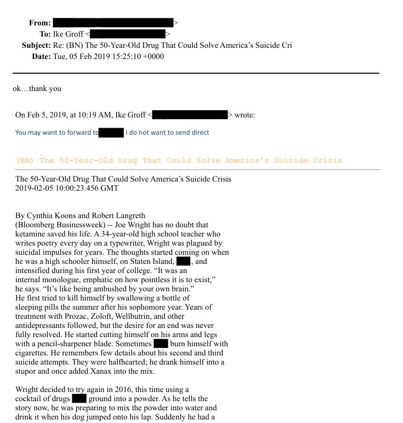 Në një email që mban titullin: Ilaçi 50-vjeçar që mund të zgjidhë krizën e vetëvrasjeve në Amerikë, të dërguar me datë 5 shkurt 2019-të, me emër dërguesi dhe marrësi të censuruar, thuhet se nga Maqedonia kanë mbërritur në SHBA rreth 1000 tru njerëzish, disa prej tyre nga persona që kanë kryer vetëvrasje.