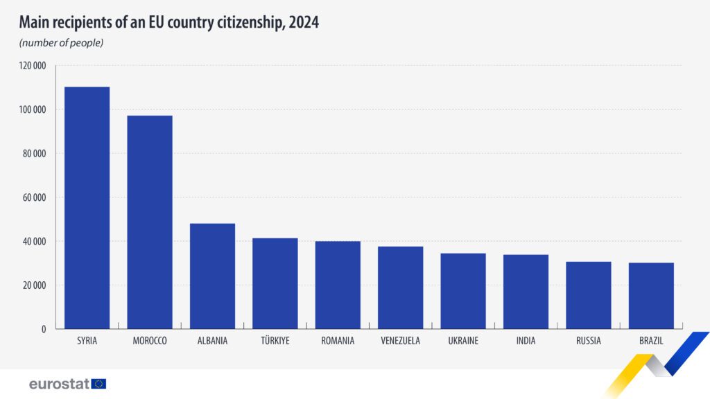 Në vitin 2024, ashtu si edhe një vit më parë, shtetasit sirianë përbënin grupin më të madh të qytetarëve të rinj të BE-së, me 110 100 shtetësi të dhëna. Shtetasit marokenë ishin grupi i dytë më i madh, me 97 100 shtetësi të dhëna, të ndjekur nga shqiptarët (48 000).