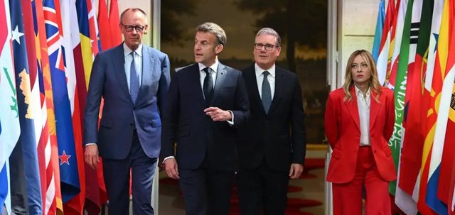 Presidenti i Francës Emmanuel Macron, kryeministri britanik Keir Starmer, kryeministrja e Italisë Giorgia Meloni dhe kancelari gjerman Friedrich Merz dolën para mikrofonëve së bashku në Paris. Paraqitja e përbashkët kishte për qëllim të dërgonte një sinjal të unitetit evropian. Megjithëse Irani sërish kërcënoi me bllokim të ri, Macron e përshëndeti fillimisht njoftimin e Iranit për hapjen e Ngushticës së Hormuzit për kohëzgjatjen e armëpushimit, por theksoi se kjo nuk ishte e mjaftueshme.
