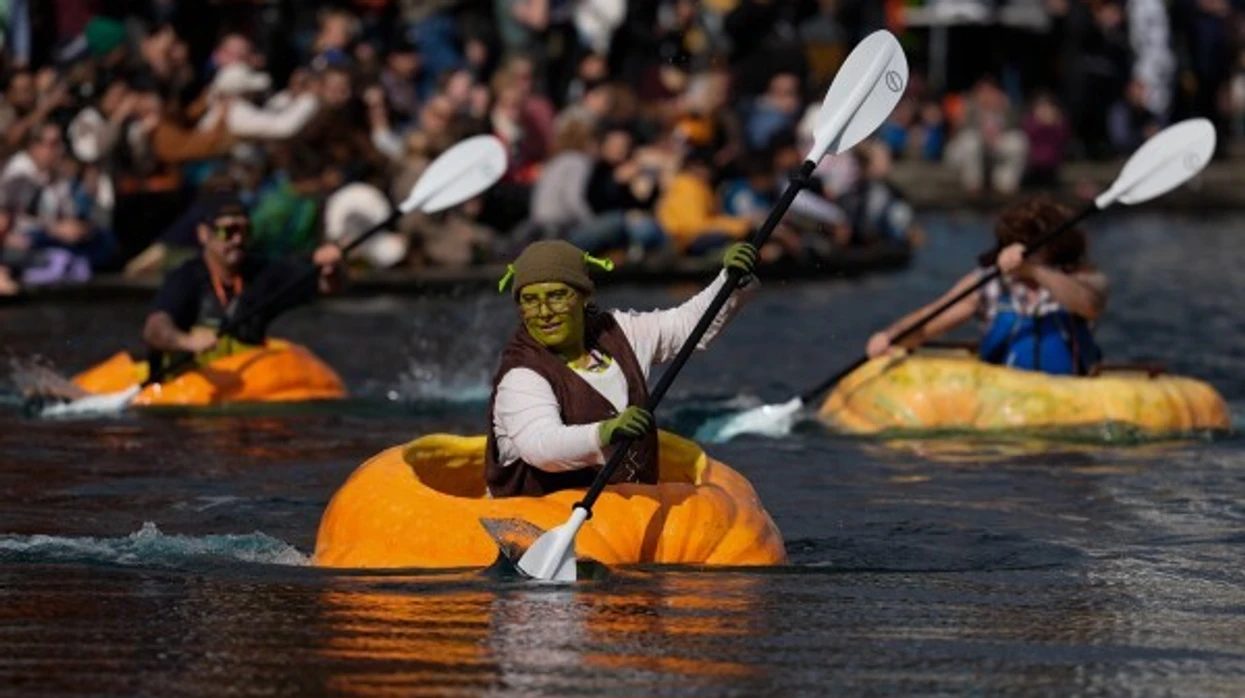 Eventi vjetor pa kunguj të zbrazët që lëviznin me vela përmes një liqeni nga njerëz të veshur me kostume të ndryshme.