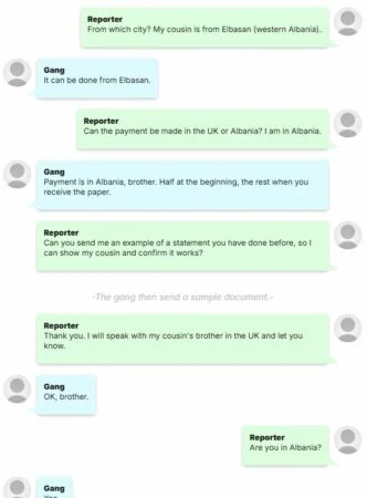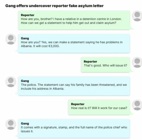Një anëtar i bandës u përgjigj: ‘ Po, mund të bëjmë një deklaratë duke thënë se ai ka probleme në Shqipëri. Do të kushtojë 3,000 euro.’I pyetur nga gazetari se nga kush do të lëshohej deklarata, përdoruesi anonim tha se ajo do të lëshohej nga ‘policia’ dhe do të përfshinte një ‘firmë, vulë dhe emrin e plotë të’ shefit të policisë. Anëtari i bandës kërkoi gjysmën e parave paraprakisht dhe pjesën tjetër pasi kishte marrë deklaratën.