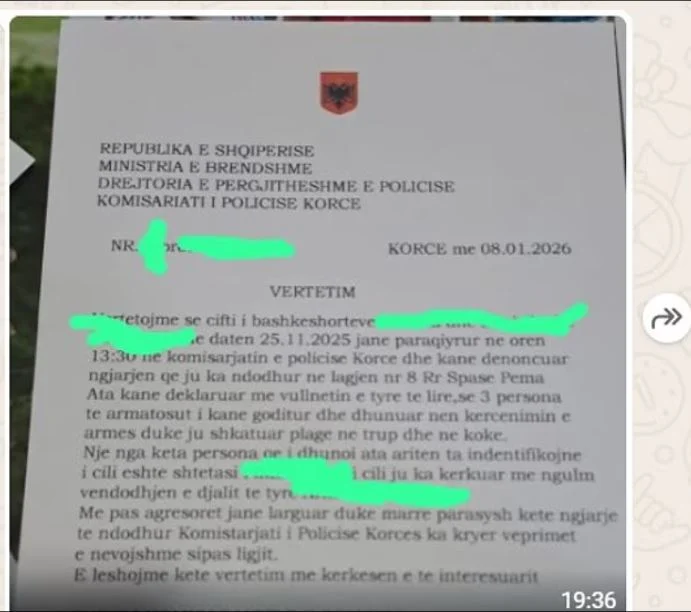 Në letër shkruhej: ‘Konfirmojmë që çifti i martuar u paraqit në Stacionin e Policisë së Korçës më 25.11.2025 në orën 13:30, duke raportuar një incident që ndodhi në Lagjen Nr. 8, Rruga Spase Pema.’