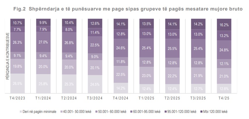 - Krahasuar me tremujorin e tretë 2025, rritja kryesore vërehet sërish në grupin mbi 120 mijë lekë (nga 14,2% në 16,2%), ndërsa intervalet 40.001–95.000 lekë shënuan ulje të lehtë. Në tërësi, shpërndarja në Tr. IV 2025 paraqitet më e përqendruar në nivelet më të larta të pagës./monitor.al