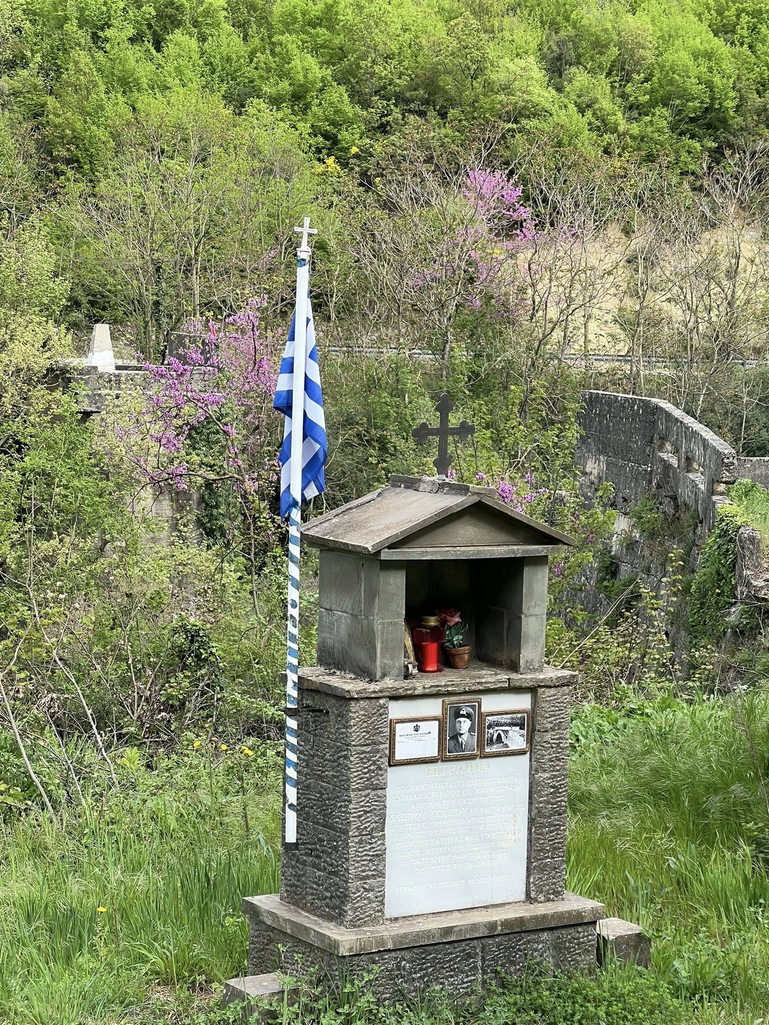 Në njërën anë, grekët kanë ngritur flamurin e tyre. Një Konizmë e vogël ku ndezin qirinj pranë tij, dhe një tabelë ku tregohet historia e urës. Po ashtu, një fotografi e vjetër, kur ura ishte ende në këmbë.
