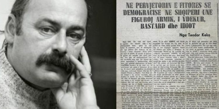 I VDEKUR dhe ARMIK! Kjo është metamorfoza ime brenda dy vjetëve demokraci. Gruaja ime vë diçka në tavë dhe më atë çast fillon të pastrojë frigoriferin. Ajo mendon për tjetër problem në këtë mbrëmje historike. Do të japë rrogën Pjetri? Pse e shqetësoj, po sa për ARMIK dhe I VDEKUR, këto gjëra duken, bile, ti je dhe diçka tjetër. Ajo konstaton që unë nuk po e kuptoj dhe më shpjegon se kolegët e gazetës «Koha jonë» kanë gjetur një intervistë të Sali Berishës, të botuar më 2 tetor 1993, në gazetën e madhe holandeze «Holanda e lirë», me një tirazh rreth 100.000 kopje, ku opozitarët, në të cilët bëj pjesë edhe unë, quhen nga Berisha IDIOTË dhe BASTARDË! Nuk dua t’i besoj veshëve, do të ishte një çmenduri për mua, po ta pohonte një gjë të tillë Presidenti i shqiptarëve. Por një nga miqtë e mi tund kokën pikëllueshëm. Ai më thotë se gjithçka është e vërtetë dhe se titulli i artikullit është afërsisht «Ata janë përsëri shumë IDIOTË dhe BASTARDË në Shqipëri». Mua më lidhet goja. Vetëm këto dhurata për 22 mars nuk i kisha pritur kurrë! ARMIK, I VDEKUR, BASTARD, IDIOT. Në fakt, janë shumë. Po t’u shtosh edhe ato «RD-ës», «RRUGAÇ», «PIJANEC», «BIZNESMEN I PAMORALSHËM», unë plotësoj kushtet ideale për t’u ekzekutuar në karrige elektrike. Nga seria e medaljeve, të fëlliqura që m’i ka akorduar Berisha, Arbnori, Meksi dhe PD-ja, më mungon vetëm ajo e SPIUNIT.