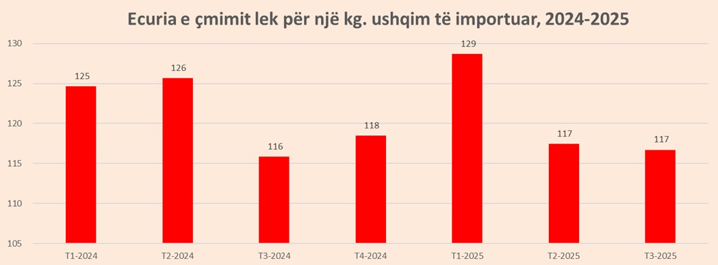Sipas të dhënave të përpunuara nga Doganat një kilogram nga grupi ”Ushqime dhe pije alkolike” kushtoi 116.7 lekë në tremujorin e tretë të vitit 2025. Kjo vlerë ishte 0.7 për qind më e ulët se në të njëjtën periudhe të vitit 2024 dhe 8 % më pak se në tremujorin e parë të vitit 2024.