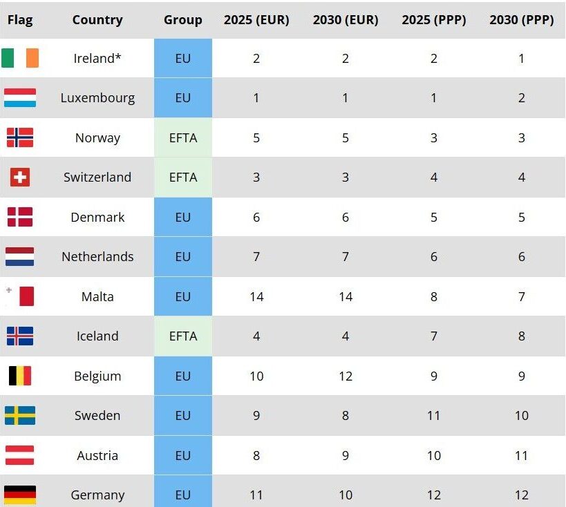 Mes 41 vendeve europiane, ku përfshihen anëtarët e BE-së, vendet kandidate, anëtarët e EFTA-s dhe Mbretëria e Bashkuar, Irlanda parashikohet të kryesojë tabelën e PBB-së për frymë sipas fuqisë blerëse deri në vitin 2030, duke zëvendësuar Luksemburgun, i cili kryeson në vitin 2025.